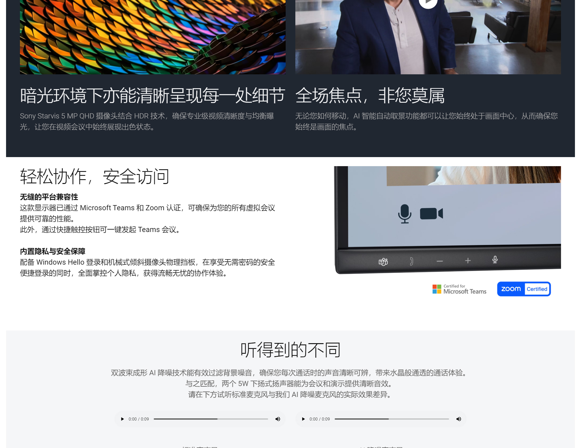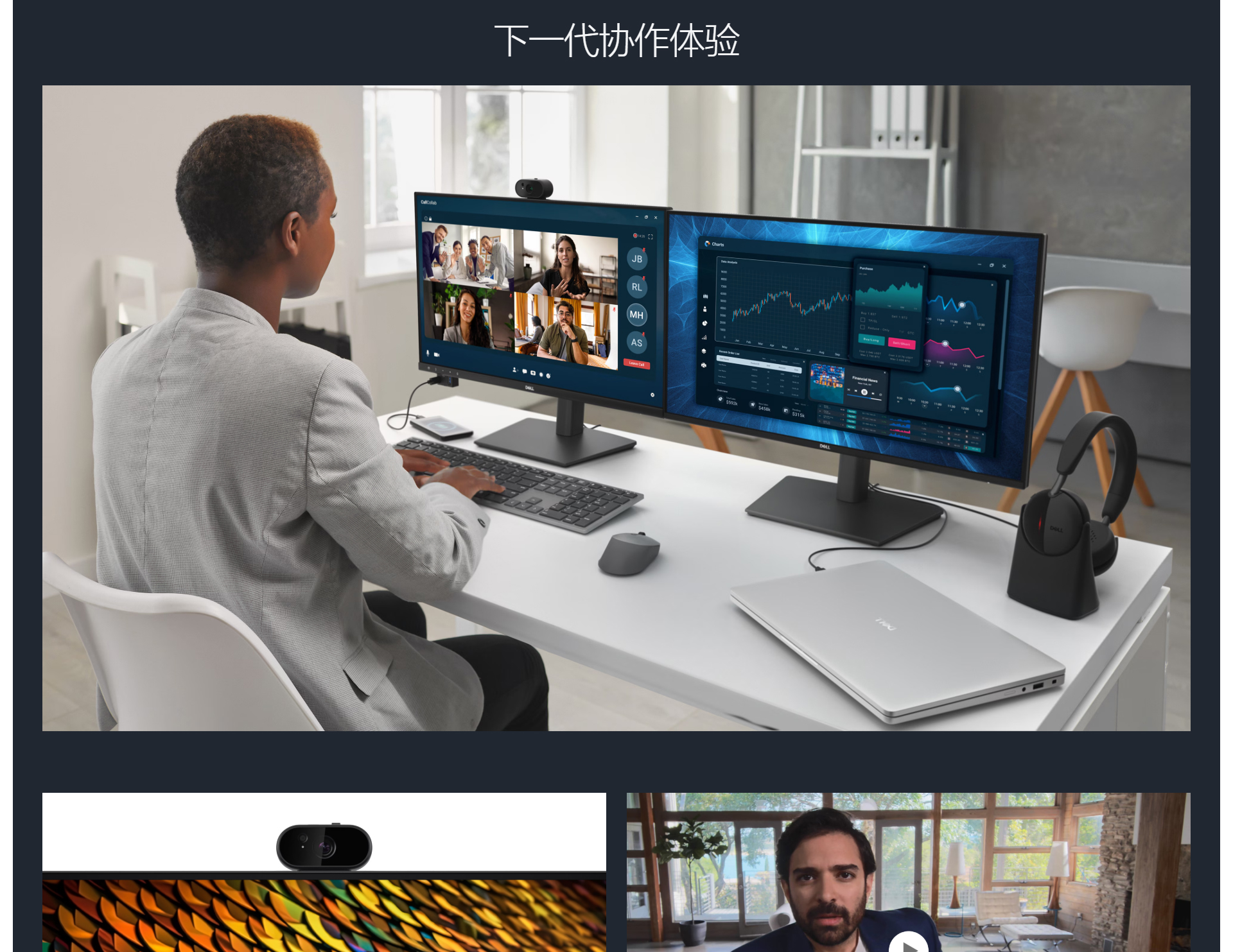 23.8 英寸全高清 IPS 显示器集成了网络摄像头、扬声器与麦克风,可全方位提升工作效率
