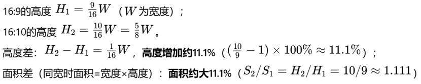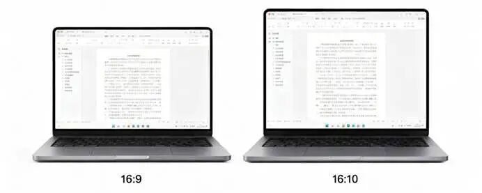 在同宽场景下,16:10的笔记本电脑屏幕比16:9面积约大11.1%,可显示的内容也就更多。以文本处理为例,相当于从27行扩展至30行,多了3行左右文本内容。